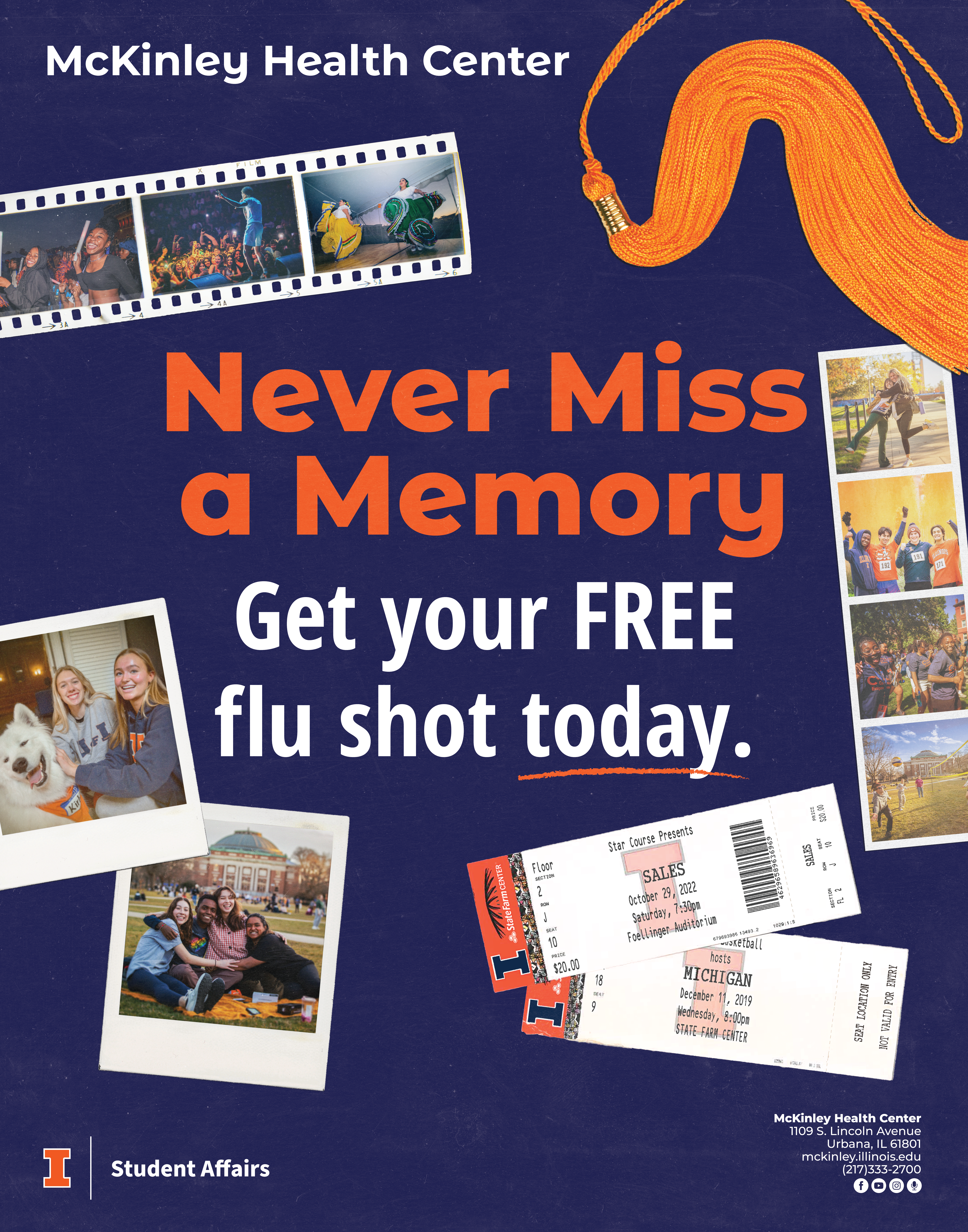 McKinley retired their previous flu campaign fall of 2024 and rolled out Never Miss a Memory. The goal of this campaign is to motivate students to get their flu shot by tapping into the fear of missing out on college memories because of getting the flu. This campaign slogan was created through the sandage project, an advertising class at the University of Illinois that focuses on developing real-world campaigns for campus and community groups.